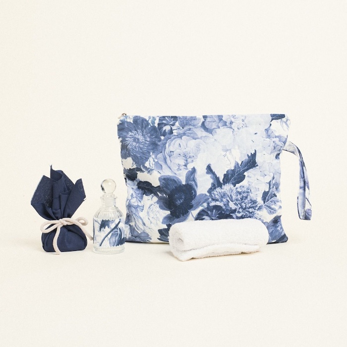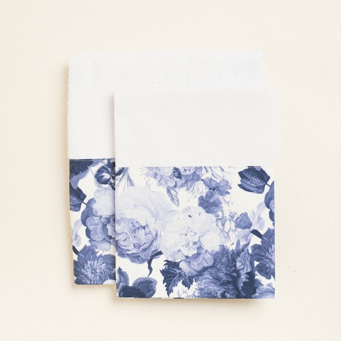 Το ιδιαίτερο μοτίβο με μπλε λουλούδια χαρίζει έναν αέρα κομψότητας και ηρεμίας, ενώ οι αποχρώσεις του μπλε δημιουργούν ένα αρμονικό και εκλεπτυσμένο σύνολο, ιδανικό για μια βάπτιση με στυλ και χαρακτήρα.