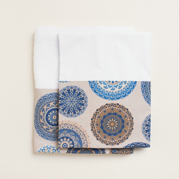 Το ιδιαίτερο σχέδιο με μαντάλες σε μπλε και γήινες αποχρώσεις δημιουργεί ένα αρμονικό και κομψό αποτέλεσμα, προσδίδοντας μοναδικό στυλ και ένταση στη διακόσμηση της βάπτισης.