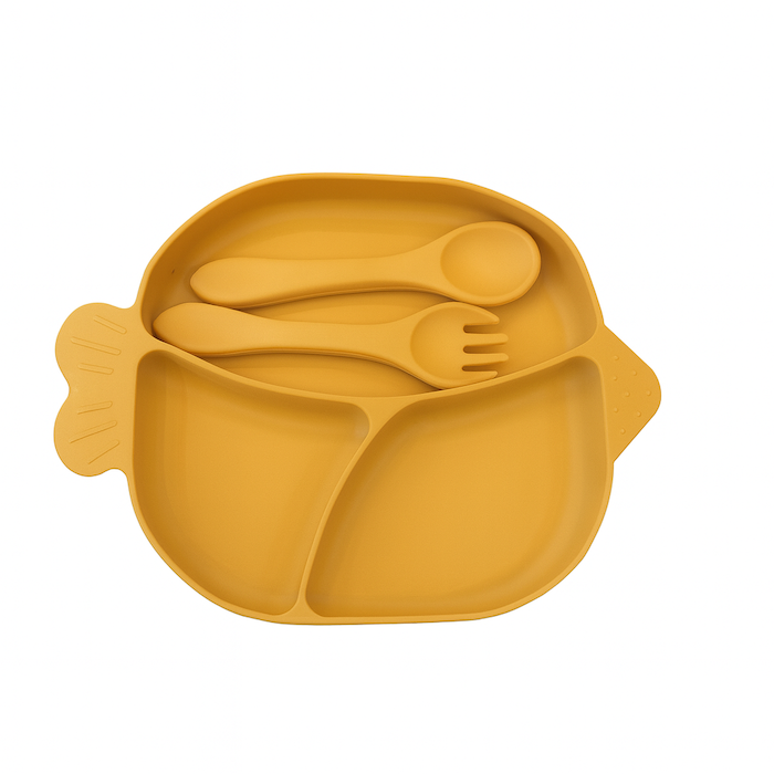 Το σετ περιλαμβάνει πιατάκι, κουταλάκι και πιρουνάκι από μαλακή, υψηλής ποιότητας σιλικόνη,