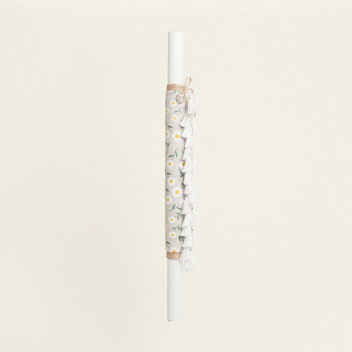 Το ανάλαφρο μοτίβο με μαργαρίτες σε απαλές λευκές και κίτρινες αποχρώσεις δημιουργεί μια φωτεινή και χαρούμενη ατμόσφαιρα, ιδανική για μια βάπτιση γεμάτη φρεσκάδα, απλότητα και φυσικό στυλ.